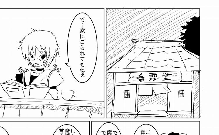 描いてる時は気づかないんですが何も考えずに描いてると、後から読み返したとき「あれ?さっきまで神社にいたのに今は違うの?」的な違和感がでてしまいます。かといって「香霖堂」とか注釈でかいたりするのは無粋な気がします。